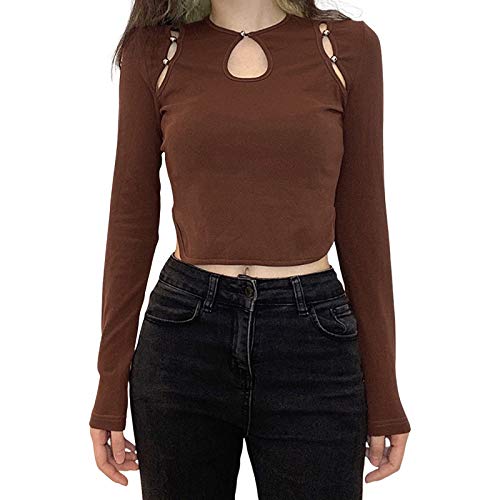 Geagodelia T-Shirt Corta da Donna a Maniche Lunghe Top Corto Chic Elegante Girocollo Marrone, XL