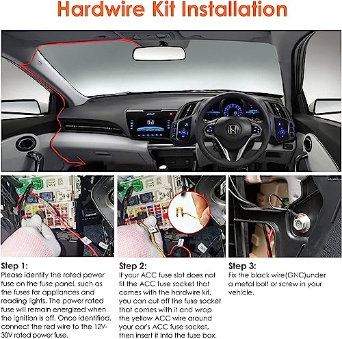 【Sorveglianza del parcheggio 24 ore su 24】 Il kit di cablaggio del veicolo Mini USB collegato alla batteria dell'auto o all'alimentazione della scatola dei fusibili, può fornire alimentazione ininterrottamente per la sorveglianza del parcheggio 24 ore su 24. La dash cam passa automaticamente alla modalità di sorveglianza del parcheggio quando spegni il motore dell'auto e torna alla registrazione normale quando è accesa.