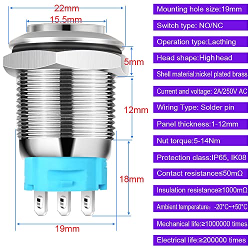 Gebildet 19 mm Testa Alta SPDT Interruttore a Scatto Impermeabile, Interruttore a Pulsante in Metallo in Acciaio Inossidabile, Terminali a Saldare DC 6V/12V/36V/48V, AC 110V/230V 2A 1NO+1NC