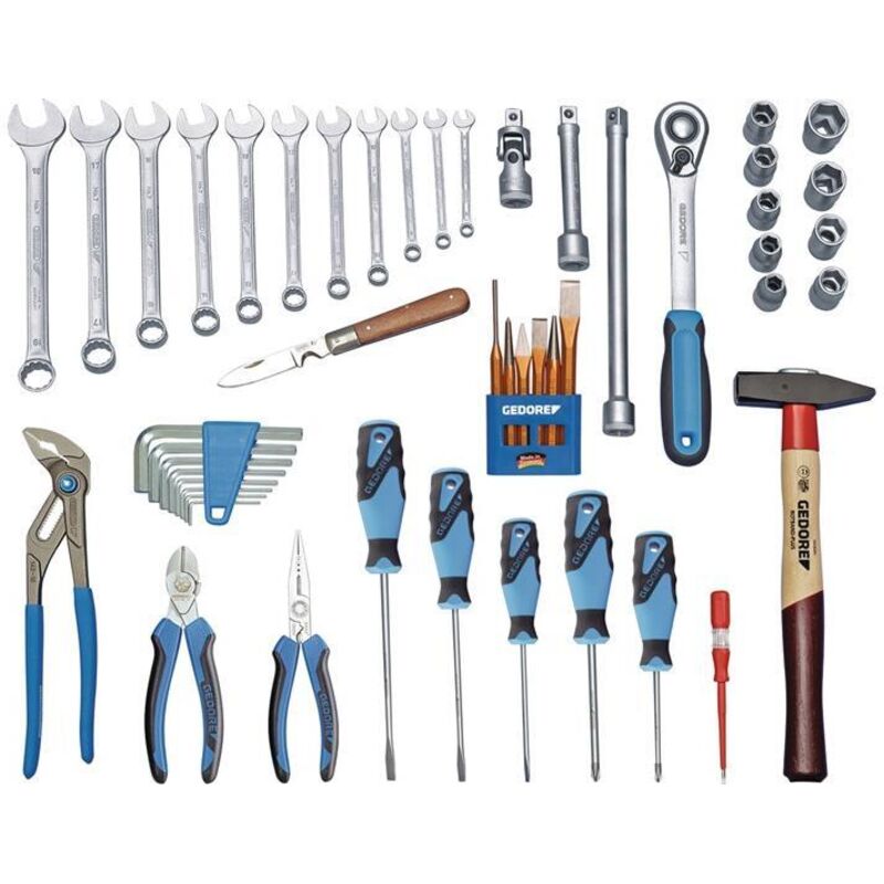 Selezione di attrezzi assortiti per le esigenze della prassi, Sistemati in una maneggevole valigetta di plastica, Compagno robusto nell'auto, in barca o nave oppure in aereo, Assistente in casa - dappertutto dove utensili buoni devono essere a portata di mano, Tutti i 49 componenti sono ben ordinati e incastrati saldamente - vi è sempre ordine e una buona visione di tutti gli utensili, Con il TOURING riparazioni e montaggio saranno un divertimento, Valigia in polipropilene soffiata, resistente ad urti, resistente contro olio e acidi, immune contro le influenze del tempo e della temperatura, con Check-Tool inserto, Utensili in acciaio al vanadio GEDORE, cromati, Misure: 437x379x160 mm, Dimensioni: L 437 x P 397 x A 160 mm