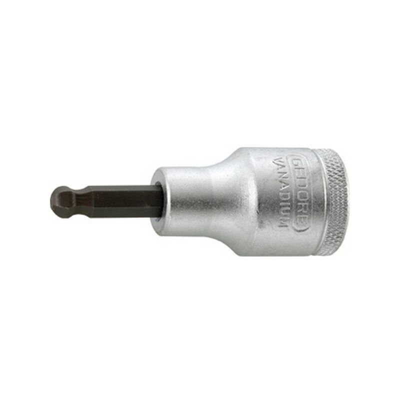 Embout de vissage 1/2'' avec tête sphérique, pour vis femelle à 6 pans Cote s/plats: 7 mm, Longueur 60 mm - Chromé mat - Acier au vanadium GEDORE 31CrV3 - Pointe traitée au phosphate de manganèse - Moletage croisé pour une meilleure prise - Entraînement à 4 pans femelle DIN 3120 - C 12,5, ISO 1174 - Gorge à billes