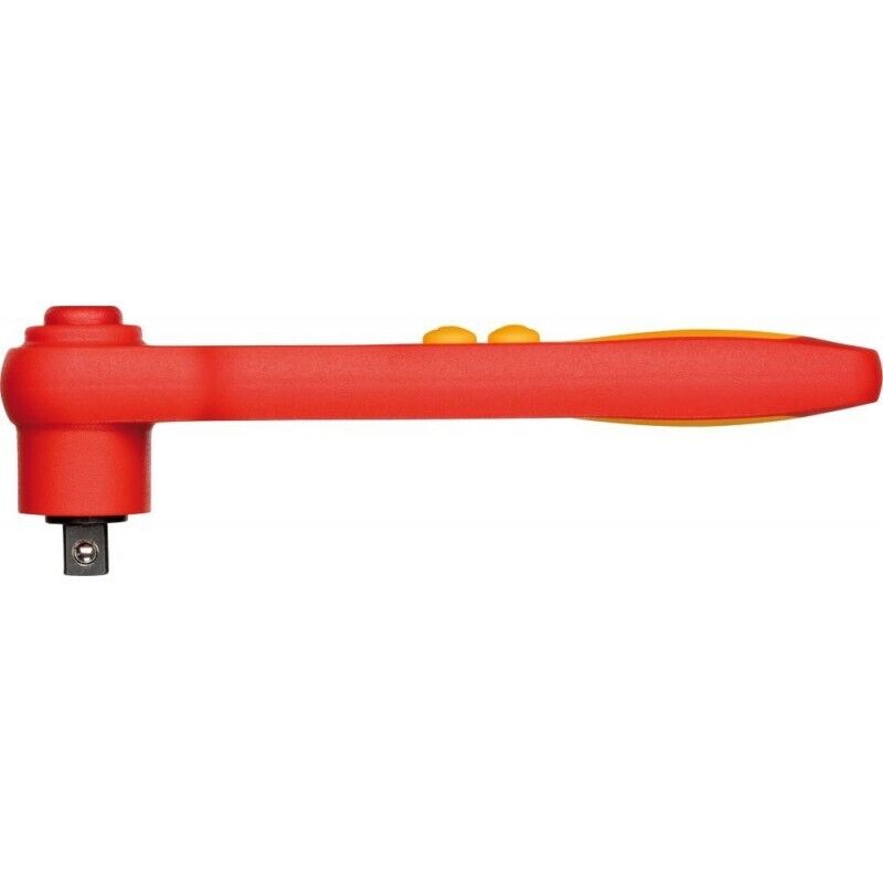 Tenuta assolutamente sicura degli utensili inseriti grazie al blocco a pulsante con sfera nel quadro di manovra, Inversione del senso di rotazione mediante 2 pulsanti con marcatura R e L sul corpo, Angolo di ripresa 8,2 gradi, Quadro di manovra sec. DIN 3120 - A 10, ISO 1174, in acciaio al cromo vanadio 31CrV3, Con rivestimento isolante VDE sec. EN 60900/IEC 60900