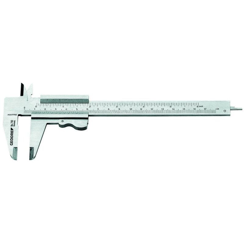 Becchi incrociati con estremità rastremate, misura di profondità e sistema di bloccaggio, Graduazione in mm e pollici, nonio da 1/20 e 1/128”, In busta di pelle, In busta di pelle