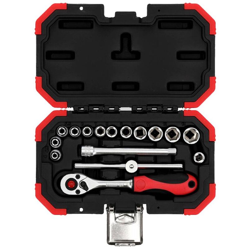 Dettagli tecnici Contenuto 1 pz. Tipo prodotto Kit di chiavi a bussola Caratteristiche Connessione quadro a norma DIN 3120 - A 6,3, ISO Vileda 1174, con blocco a sfera Azionamento quadro incassato a norma DIN 3120 - C 6,3, ISO Vileda 1174, con scanalatura di raccolta a sfera 2K-cricchetto reversibile 1/4, rotazione a destra/a sinistra la leva commutabile, l'azionamento di un pulsante, con dentatura fine, testa ovale, impugnatura bicomponente, non aggressivi sulle mani trasmissione della potenza, per inserti per chiavi a tubo Inserto per chiave a bussola 1/4, 6, metriche, corto, modello in conformità con DIN 3124, ISO 2725 Prolunga per chiavi a bussola 1/4 Leva con attacco scorrevole con blocco di scorrimento 1/4, modello in conformità con DIN 3122, ISO 3315 Adattatore punta 1/4, con esagono interno e quadrato interno, per tutti i bit e utensili con 1/4 esagonale Acciaio al cromo-vanadio, cromato satinato opaco Per azionamento manuale trappola a vite Valigetta in plastica in design red