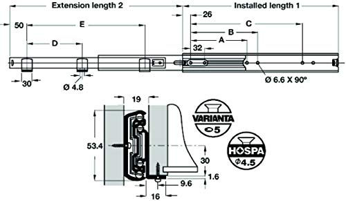 Guide a sfera DZ5517‐60 con lunghezza di montaggio: 300 mm - Lunghezza di estrazione 325 mm - Altezza: 53,4 mm - Spessore binario: 19 mm - Guide estrazione di alta qualità e molto stabili.