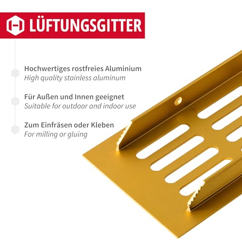 Materiale: alluminio - materiale solido - superficie: piastra di ventilazione in ottone anodizzato oro - dimensioni: 400 x 60 mm - la griglia di ventilazione stabile è adatta per l'esterno e l'interno