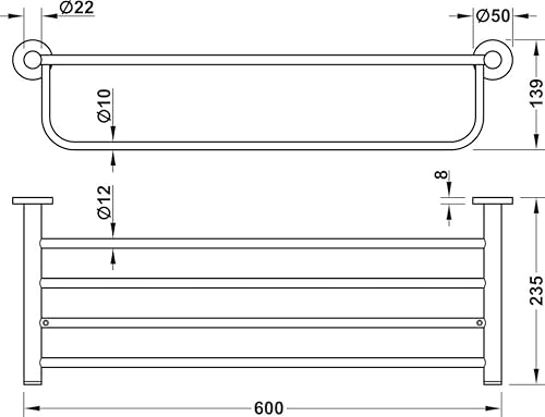 portasalviette grande con rosone Ø: 50 x 8 mm - supporto per asciugamano: 555 x 160 x 120 mm - totale: 628 x 235 x 139 mm - sporgenza: 235 mm