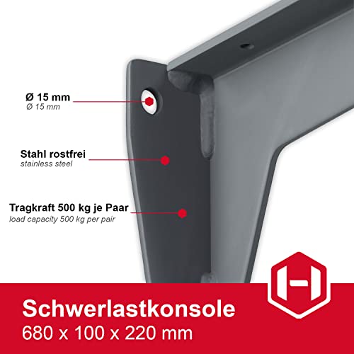 GedoTec Vettore carico pesante Supporto-mensola Console carico pesante MIRA FORTE Acciaio grigio Forza portante 500 kg Lunghezza 380 - 780 mm fatto germania - 680 mm