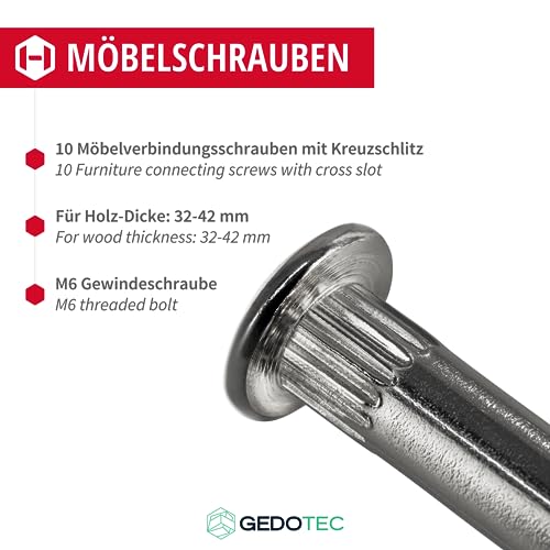 Gedotec Viti per mobili M6, 100 pezzi, viti di collegamento in acciaio nichelato, spessore del legno 32 - 42 mm, connettore per armadio a croce PZ2 e lama piatta, connettori per mobili
