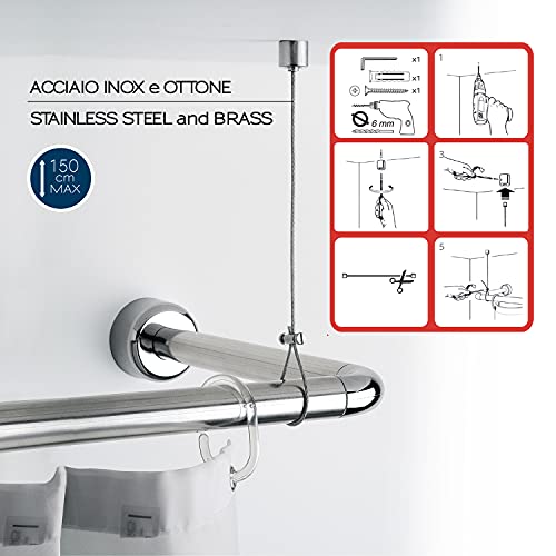 Gedy cromata, reggitenda Doccia, Misure: 0,5X150X2 CM, Altezza Regolabile Fino 150cm, Cavo Tenda in Acciaio, Supporto a soffitto con Finitura, Design R&S, 2 Anni di Garanzia, Unica