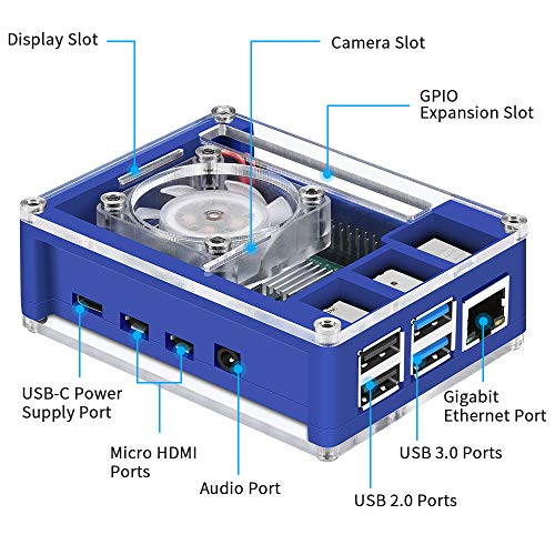 GeeekPi Raspberry Pi 4 Custodia,Raspberry Pi 4 Custodia con Ventola 40X40X10mm (retroilluminazione Blu) e 4 Pezzi Raspberry Pi 4 dissipatori per Raspberry Pi 4 Modello B (Blu&Trasparente)