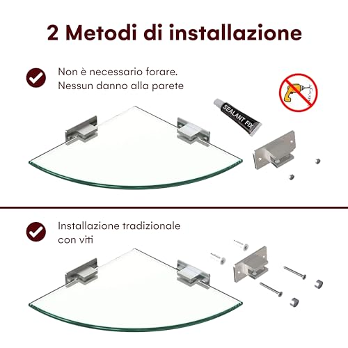Facile e robusto: il ripiano angolare in vetro viene fornito con hardware di montaggio. Utilizzare colla o sigillante senza unghie per installare su superfici lisce o ruvide. Dopo l'installazione, attendere 48 ore prima dell'uso.