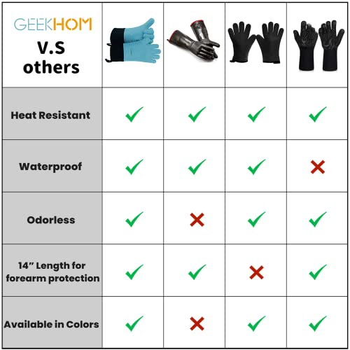 stenza al calore fino a 230 ° C/446 F I guanti da forno Geekhom sono realizzati in silicone 100% FDA e privo di BPA, impermeabili e stenti all'umidità, stenti al calore da -75 ° C a 230 ° C. Ti darà una maggiore protezione quando usi questi guanti da forno in silicone su barbecue, grigliate, cucinare, cuocere.