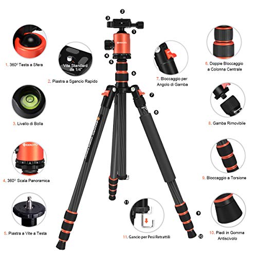 Utilita Multiplo: La gamba rimovibile con spugna può essere svitata e lavorare da sola come monopiede per macchina fotografica o alpenstock da escursione, oppure puoi assemblarla con la colonna centrale per renderla più lungo per offrire una gamma di altezze regolabili da 54cm a 208cm a soddisfare le diverse idee fotografiche. E l'installazione invertita della colonna centrale realizza le riprese super basse e un ottimo controllo macro per rendere la tua fotografia più diversificata