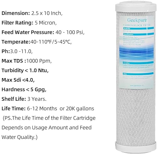 Geekpure Cartuccia filtro di ricambio per blocchi di carbonio da 10 pollici per sistema di filtrazione dell'acqua RO -2,5 "x 10" - Confezione 4-5 micron