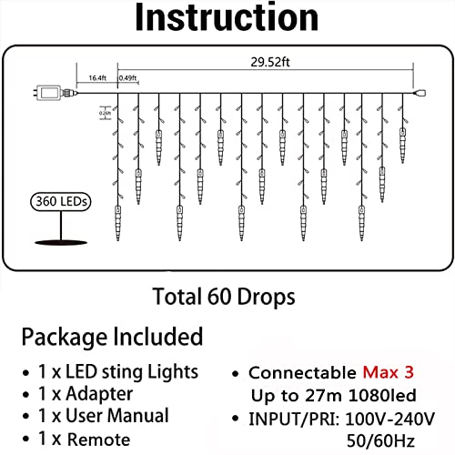 ➤ Cascata luci natalizia esterno con 360 LED Colorate, 60 Ghiaccioli, con spina UE e trasformatore, lunghezza totale circa 14 m (di cui 5 m di cavo). Le luci natale esterno sono collegabili, max 3.
