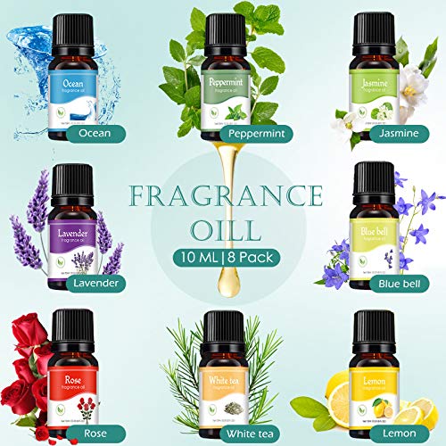 1. ♥8* Oli Essenziali di Regalo Set♥: 8 bottiglie di 10ml di olio essenziale include: 1. Oceano, 2. Lavanda, 3. Menta, 4. Limone, 5. Rosa, 6. Gelsomino, 7. White Tea, 8. Blue Bell. Gli oli essenziali puri sono estratti da piante naturali. Sono amichevoli per tutti, anche per neonati, bambini e anziani.