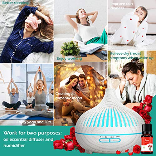 GeeRic Diffusore di Oli Essenziali 500 ML, 8 * 10ML Oli Essenziali+Ultrasuoni Umidificatore Purificatore d'Aria Diffusore di Aromi Nebulizzatore per Oli Profumati 7 Color LED per Casa Yoga Spa Bianco