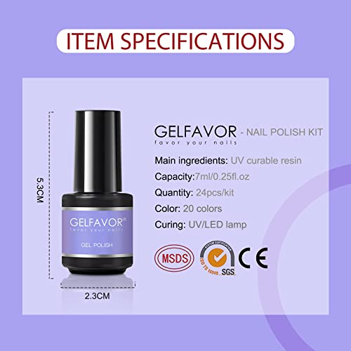 ◖Smalto semipermanente GELFAVOR◗: 24 pezzi di cui 20 colori e 4 strati (primer, base coat, top coat, matte coat) di questo kit di smalto gel. La capacità dello smalto gel è 7 ml / 0,25 fl.oz, lo strato è 10 ml / 0,34 fl.oz.