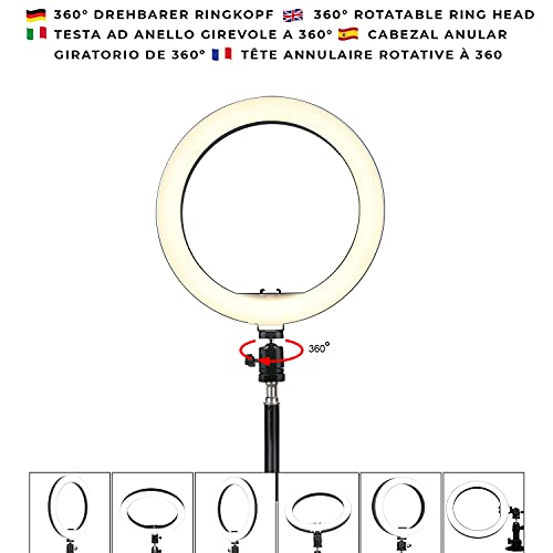 FLESSIBILE: grazie al collo d'oca, la luce ad anello può essere regolata rapidamente e facilmente al modello. Inoltre, la testa ad anello può essere inclinata e ruotata di 360°.