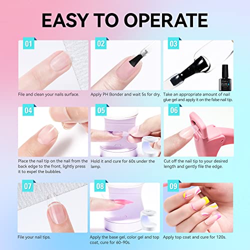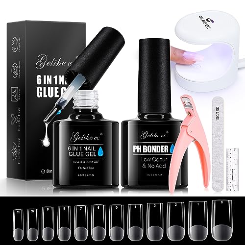 Gelike ec Punte per Unghie Quadrate Medie e Kit di Colla Gel - Mini Lampada per Unghie con 6 in 1 Colla per Unghie PH Bonder 240 Pezzi Punte per Unghie Copertura Completa Lima per Unghie Tagliaunghie
