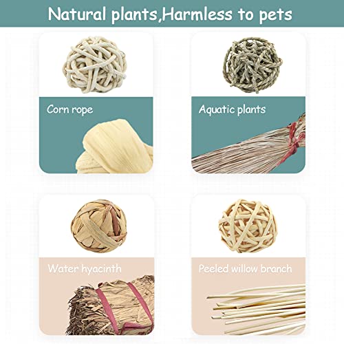 Materiale naturale: questi giocattoli per conigli sono realizzati al 100% in materiali naturali, non tossici, fatti a mano e sicuri con zero colorazioni. Le materie prime sono erba naturale, buccia di mais e pigne di pino. Robusto e sicuro, non danneggia i vostri piccoli animali domestici durante il gioco.