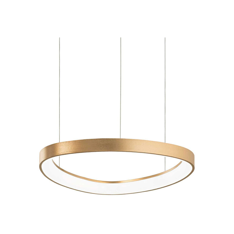 Collezione Gemini FORME GEOMETRICHE SOSPESE Sospensione dalla forma geometrica diam.42,2 cm con rosone e paralume in metallo verniciato a polveri o placcato.. Luce led integrata 38 W tonalità calda 3000 K. Diffusore in policarbonato opale. Cavo in pvc trasparente. Finitura ottone.