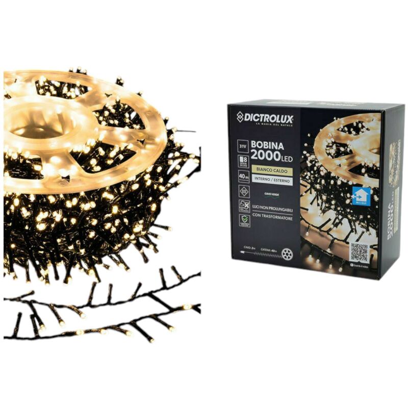 Luci Led - Marca General Trade - Bianco caldo - 8 giochi di luce - Per interni ed esterni - Con cavo colore verde Luci 2000 Led bianco caldo. La catena da 2000 luci Led bianco caldo per esterno programmabile è l'ideale per addobbare ed illuminare la vostra casa ed il vostro albero di Natale. Le luci sono disposte su 40 metri di catena oltre a 2 metri di cavo avvolte su una pratica bobina. Utilizzabili anche all'esterno ed i giochi di luci sono programmabili. Cavo verde.
