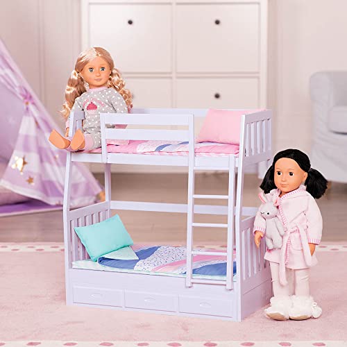 Raddoppia il divertimento della tua bambola con i nostri Dream Bunks Our Generation - Lilac! Questo fantastico set letto a castello per bambole da 46 cm è perfetto per bambole gemelle e bambole BFF che hanno un pigiama party.