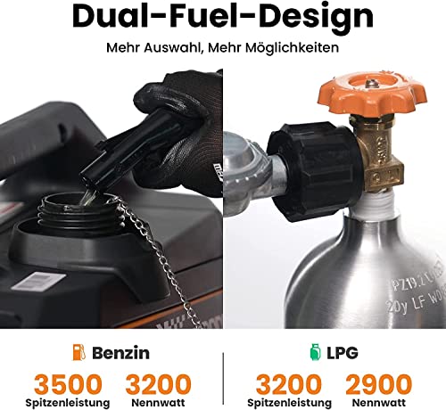 Il generatore richiede può funzionare con 2 tipi di alimentazione, benzina o gas gpl. Quando il generatore funziona a benzina ha una potenza massima di 3500w e funziona a 3200w.Quando il generatore funziona a LPG ha una potenza massima di 3200w e una potenza di funzionamento di 2900w