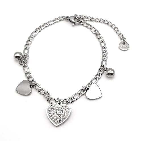 Generico Bracciale Cuore Donna | Braccialetto Regolabile a Maglie Catena Figaro con Ciondoli Love Charm Cuori Perline e Strass | Color Argento