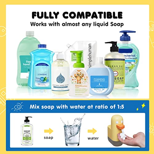【NOTA】Ci sono due tipi di Sapone Liquido per le mani: tipo gel e tipo schiuma. Genialba Bubble Duck Distributore di Sapone può utilizzare direttamente il tipo schiuma. Se si utilizza il tipo di gel, deve essere diluito con acqua prima dell'uso. Consigliamo un parte gel, 3-5 parti di acqua.