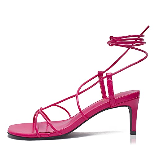 GENSHUO - Sandali da donna con tacco aperto, con lacci, alla moda, con punta quadrata, Rosso (Rosso rosato), 37 EU