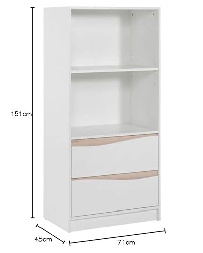 Un sacco di spazio di archiviazione in 2 ripiani aperti e 2 cassetti.