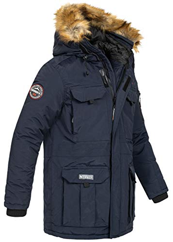 Geographical Norway Bottle Men - Parka caldo da uomo, impermeabile, con cappuccio in pelliccia sintetica, giacca calda da vento, invernale, fodera esterna, giacca da uomo (Marino, S)