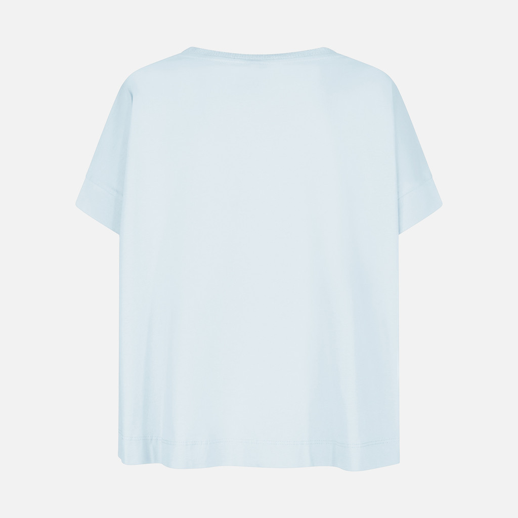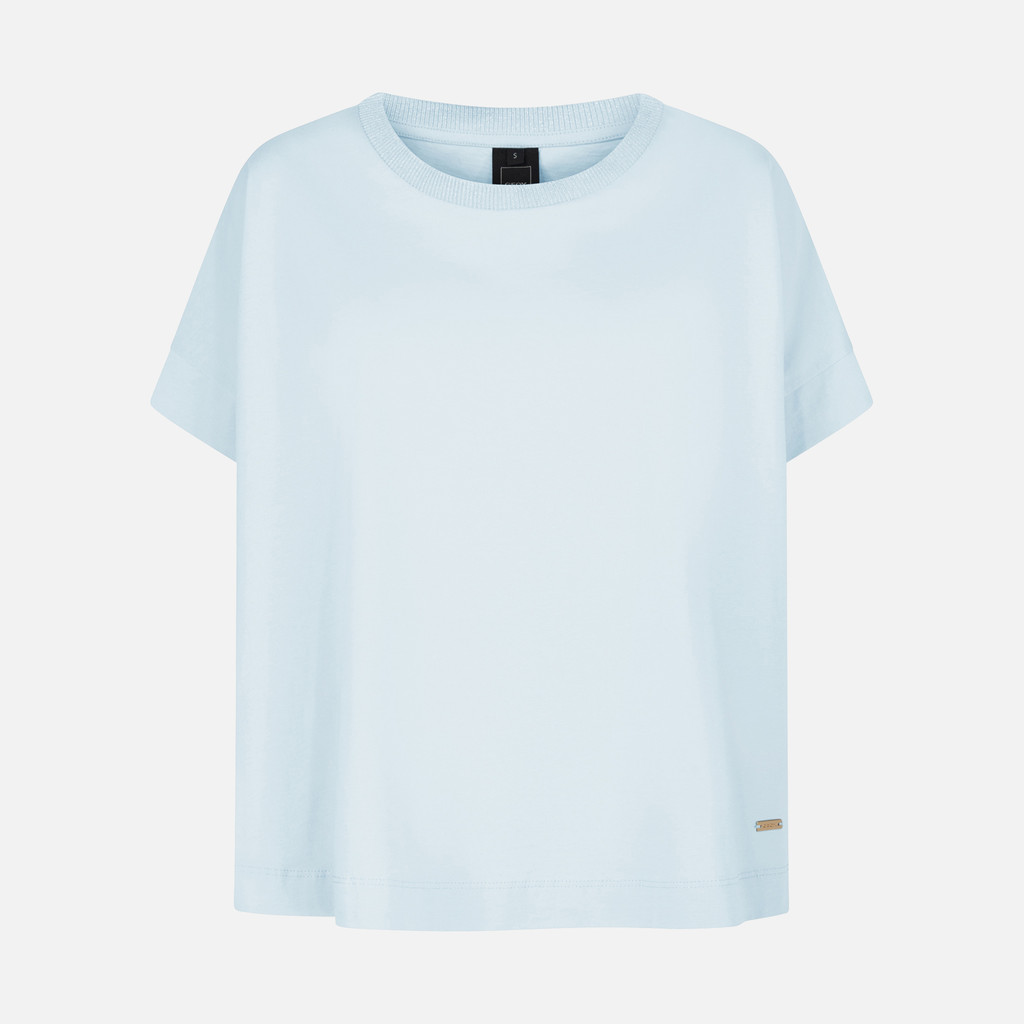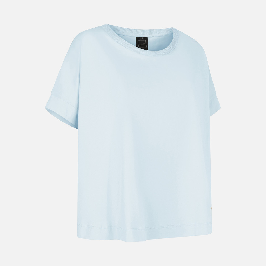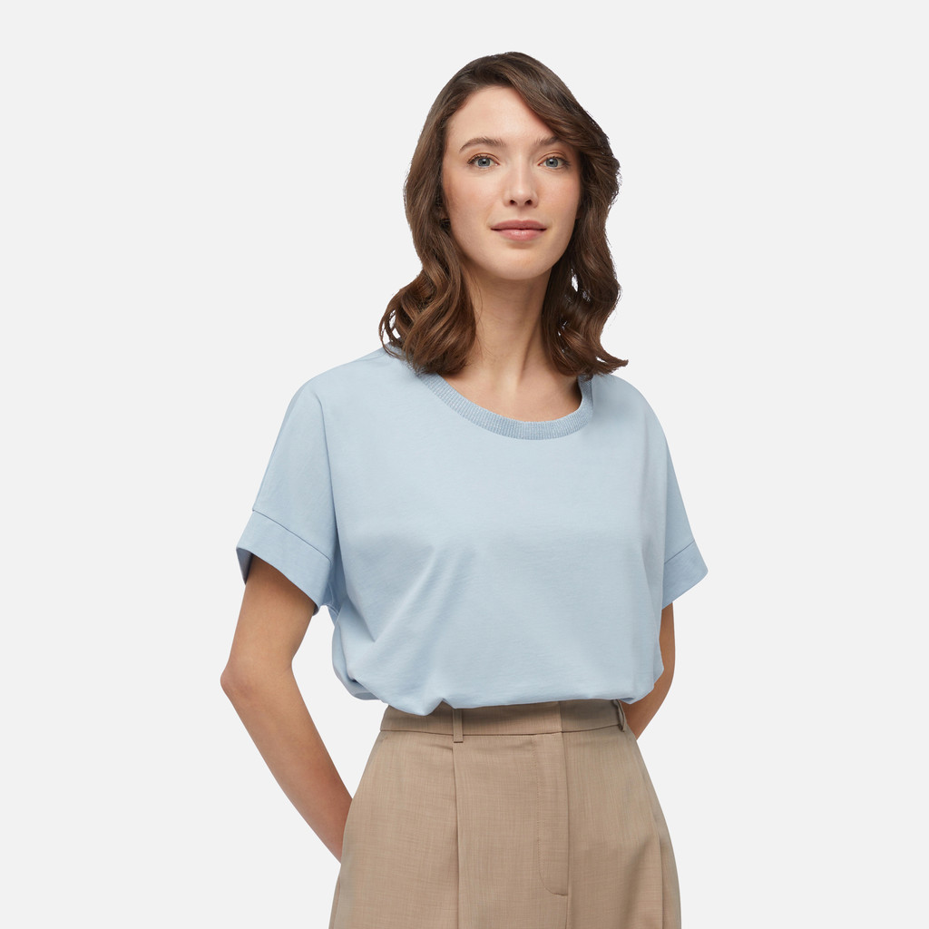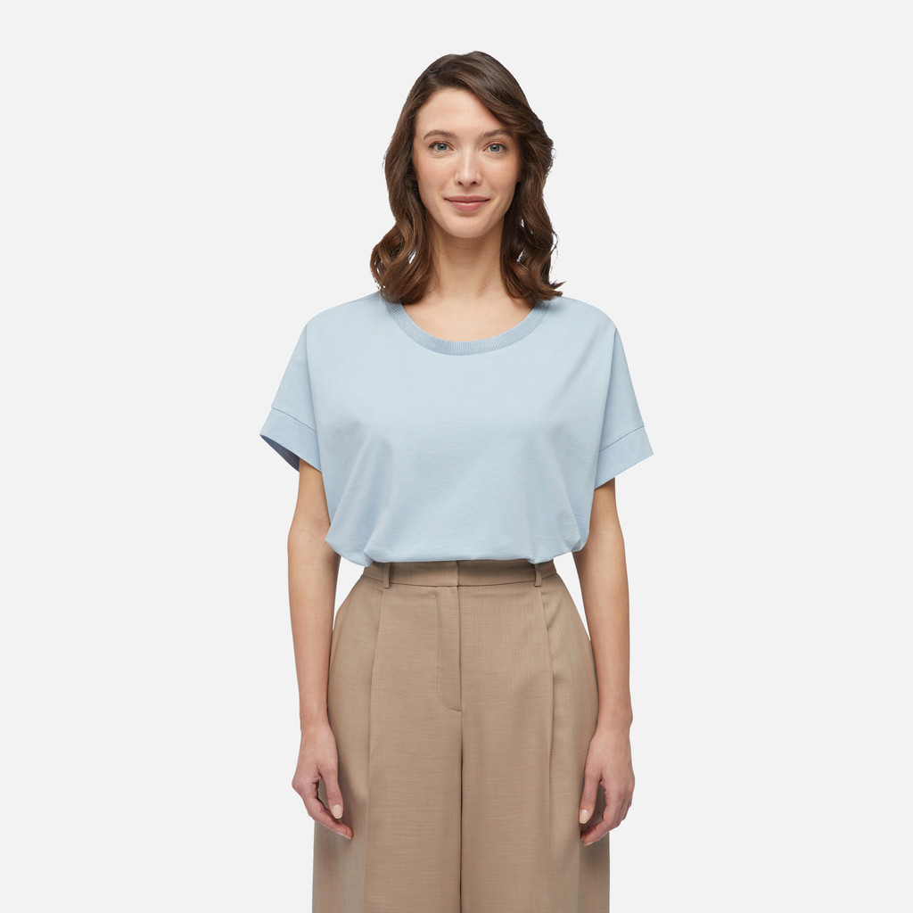 Leggera t-shirt donna a manica corta dalla vestibilità oversize, adatta dall'ufficio al tempo libero. Leggera t-shirt donna a manica corta dalla vestibilità oversize, adatta dall'ufficio al tempo libero. Pratica e confortevole, è realizzata in jersey di cotone certificato BCI (Better Cotton Initiative) ed è qui proposta in un raffinato celeste polvere. Arricchita da un girocollo in lurex, è un top perfetto per aggiungere un tocco casual ma al contempo femminile ai look cittadini quotidiani.