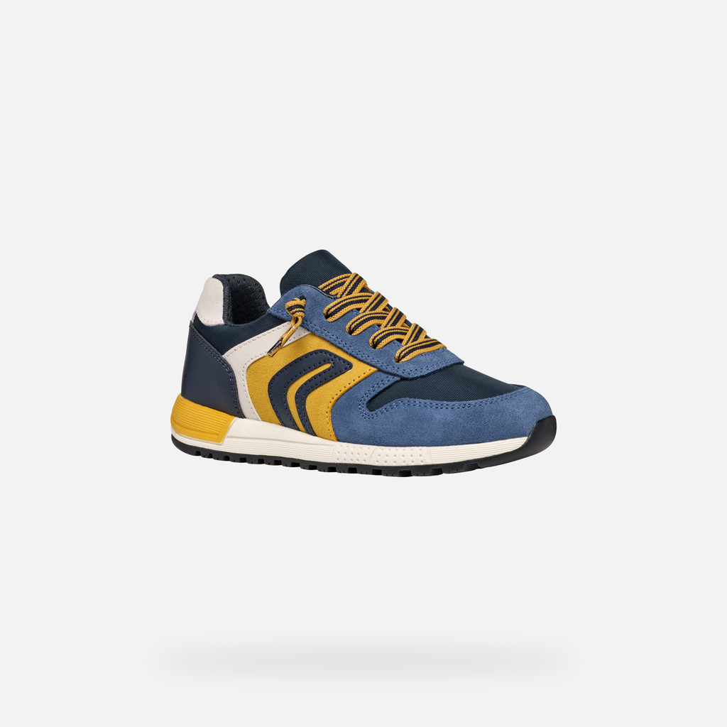 Sneaker low-cut bambino d'ispirazione running dal gusto retrò, comoda e traspirante. Sneaker low-cut bambino d'ispirazione running dal gusto retrò, comoda e traspirante. Qui proposta in color denim con dettagli gialli, Alben è un modello perfetto per completare gli abbinamenti casual e sportivi. Realizzata in scamosciato e nylon, è garanzia di comfort grazie ai lacci elastici e alla suola ammortizzata.