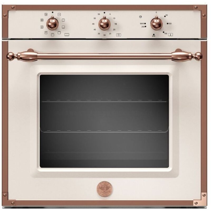 Forno elettrico 76 litri Bertazzoni avorio rame F609HEREKAC classe A Questo forno elettrico da incasso da 60 cm della Serie Heritage offre la cavità più grande della sua categoria: 76 litri. Grazie alle sue 9 funzioni ideale per cuocere a temperature medio-basse, come nel caso dei lievitati o di ricette che richiedono cotture lente, come quella in casseruola. La cottura statica perfetta per le torte, mentre quella ventilata assicura una distribuzione uniforme del calore su tutti i cinque livelli per arrostire e cuocere senza che i sapori si mescolino. Il grill a infrarossi garantisce rosolatura e grigliatura intense su ampie superfici. Il controllo del forno facile grazie alle manopole in metallo e alla porta ad apertura silenziosa dotata di pratica maniglia in metallo. Il doppio vetro assicura sicurezza ed efficienza. Colore avorio con finitura in rame. Caratteristiche tecniche Misura: 60 cm Alimentazione forno: elettrico Tipo forno: multifunzione elettrico Tipo grill forno