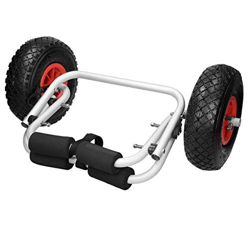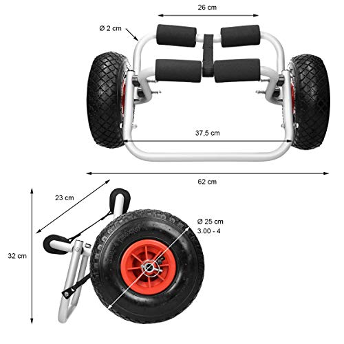 COSTRUZIONE ROBUSTA E LEGGERA - Le ruote pneumatiche e la robusta costruzione in alluminio anodizzato consentono un carico fino a 80 kg. L'ampio supporto garantisce un supporto sicuro e protetto durante il carico e lo scarico. Con soli 3 kg (ruote comprese), il carrello della barca è estremamente leggero.