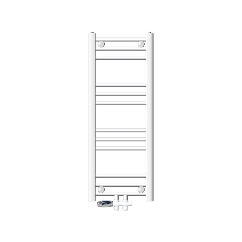 Contenuto: Radiatore da bagno 300 x 800 mm - bianco dritto Bocchetta d'aria da 1/2 pollice Tappo cieco da 1/2 pollice Termostato con set di collegamento centrale collegamento al pavimento / (versione dritta - se i tubi escono dal pavimento) Set di montaggio a parete: 4 x staffe a muro 4 x viti e tasselli 4 x viti per staffe 4 x rondelle Informazioni tecniche: Radiatore da bagno Materiale: Acciaio Colore: bianco Larghezza (mm): 300 Altezza (mm): 800 Connessioni (mm): 255 Diametro del tubo: Ø22 Profilo (mm): 30*40*1,5 D Configurazione dei tubi: 3+3+3+3 Quantità di tubi: 12 Potenza termica (Watt a 85°/75°/20°C) DT50: 255 Volume d'acqua (L): 2,53 Peso (Kg): 3,91 Pressione massima di esercizio: 10 bar (1 MPa) Pressione di prova: 12 bar (1,2 MPa) Profili a D verticali 30 x 40 x 1,5 mm tubi tondi orizzontali 22 x 1,2 mm Distanza dalla parete: circa 6,5 cm Set di connessione per distanza tra i tubi 50 mm - connessione centrale Raccordo multiblocco a due tubi pressione massima di esercizio