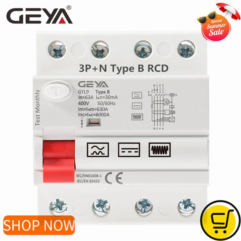 GEYA Din Rail Earth Leakage Current breaker DC RCCB RCD 4P 63A 30mA 300mA Type B 10KA