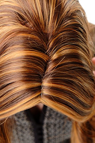 Meravigliosa parrucca di qualità, da donna, in diverse tonalità di castano chiaro e castano scuro. Arriva alle spalle, è liscia e ha la riga in mezzo.