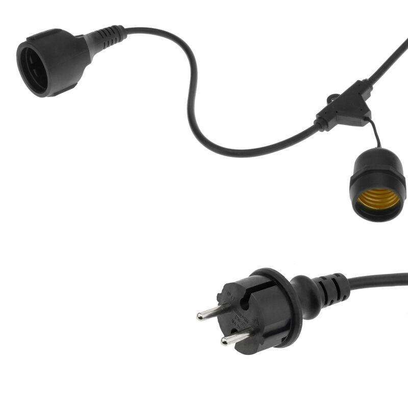 Ghirlanda decorativa per illuminare spazi installabile sia all'interno che all'esterno grazie alla sua protezione idrorepellente. La sua lunghezza è adattabile grazie alla possibilità di collegare più ghirlande alla spina e la flessibilità del cablaggio permette una facile e pratica installazione in molteplici situazioni. Caratteristiche del prodotto: CARATTERISTICHE: Apparecchio di illuminazione con 10 prese tipo E27 per lampadine installabili sia all'esterno che all'interno. L'unione tra il filo della lampadina e il cavo elettrico si distingue per essere a forma di T, consentendo così un'installazione più comoda per l'utente e conferendo così al prodotto un profilo più elegante. DESIGN: tutto il cablaggio è nero. Per quanto riguarda la disposizione delle lampadine, la distanza tra la spina schuko e il primo attacco è di 25 cm. Ciascuna di queste basi per lampadine, invece, si trova all'estremità di un tubo flessibile di 10 cm, e ciascuna delle giunzioni del tubo flessibile con il