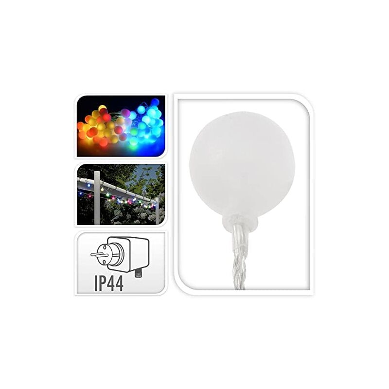 80 led multicolore ghirlanda ip44 spazio tra le lampadine 20cm 25mm diametro sfere 220-240v colori brillanti cavo di alimentazione 3m. distanza tra la prima lampadina e l'ultima 16m. lunghezza totale: 19m.