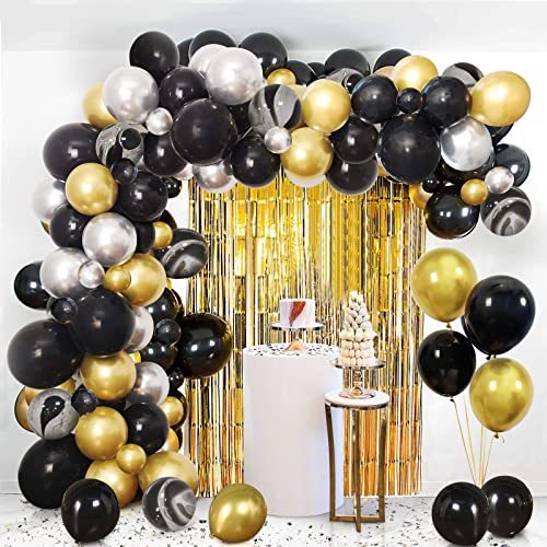 Kit Ghirlanda Palloncini, Kit Arco Palloncino Oro Nero Argento con Tende Metalliche Tinsel Happy Birthday Coriandoli per Uomini Donne Festa Compleanno,Baby Shower Party
