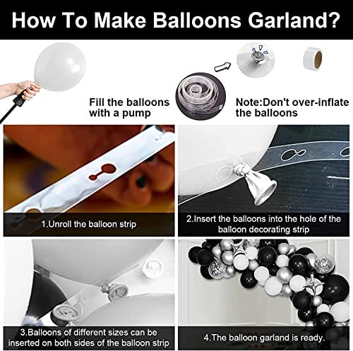 FACILE DA DECORARE:Il kit di archi di palloncini bianchi neri e argento è molto facile da assemblare.La ghirlanda di palloncini è riempita solo di aria e non di elio.Per tua comodità, forniamo già strisce di palloncini e colla a punti per aiutarti a fare ghirlande o archi di palloncini.