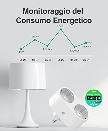 GHome Smart Presa Smart Wifi, 2-in-1 Plug con Monitor di Energia, Programmabile Prese Doppia Alexa con Funzione Timer, Controllo tramite e APP, Compatibile con Alexa e Google Home, Bianco