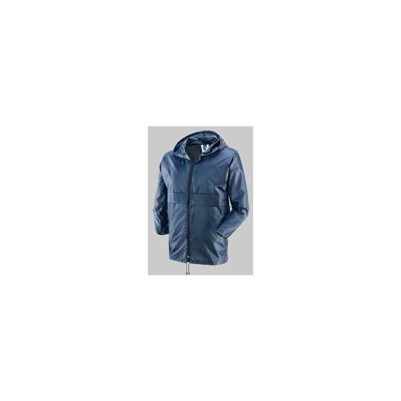 Materiale: 100% nylon. Cappuccio fisso con coulisse. Chiusura con cerniera. Tasca laterale con cerniera. Coulisse al fondo. Ripiegabile all'interno della sua stessa tasca, con fibbia per aggancio in vita. Colore blu.