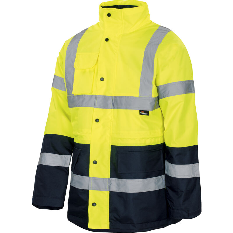 Parka 2 in 1 2 strisce riflettenti larghe 5 cm che corrono intorno al busto e alle braccia e 1 x 5 cm ciascuna sulle spalle impermeabile e antivento grazie alle cuciture sigillate Fodera trapuntata removibile con protezione efficace contro il freddo e polsini in maglia Collo con cappuccio integrato Cerniera frontale a 2 vie con abbottonatura e automatici coulisse regolabile in vita, inserti a contrasto in blu navy impermeabile: 3.000 mm Borse: 2 tasche sui fianchi con patta Taschino sul petto/tasca portacellulare con patta e chiusura in velcro Tasca interna con chiusura in velcro Tasca di sicurezza laterale con cerniera/tasca Napoleone Tasca nascosta per carte d'identità nella tasca laterale sinistra caratteristiche tecniche: DIN EN 343 - indumenti protettivi - protezione contro la pioggia, classe 3 DIN EN ISO 13688:2013 - Indumenti di protezione - Requisiti generali DIN EN ISO 20471:2013 - Indumenti di avvertenza ad alta visibilità, materiale di base di classe 3 almeno 0,8 m2