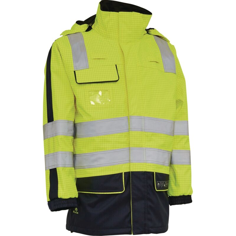 EN 1149-5, EN ISO 20471 Kl. 3, EN ISO 11611 Kl. 2 A1+A2, EN 13034 PB [6], EN ISO 11612 A1, A2, B1, C1, E3, F1, EN 343 Kl. 3/3, IEC 61482-2 - 98 % Poliestere Oxford 300D X 300D / 2 % Carbonio, circa 340 g/m² - Fodera: 100 % Cotone FR - Colonna d'acqua: >. 8. 000 mm - Traspirabilità: >. 5.000 g/m2/24h - Cuciture nastrate - Strisce riflettenti - Tasca per smartphone - Zip a 2 vie - 2 tasche sul petto - 3 tasche con velcro - Doppia pattina anti-intemperie con velcro - Tasca porta-identità - Cappuccio staccabile Altre caratteristiche tecniche: - Peso del tessuto circa: 340g/m²